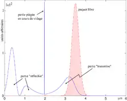On observe que la fonction d'onde est en grande partie transmise, qu'elle est considérablement déformée par rapport au paquet entrant, et qu'elle est en retard sur un paquet qui n'aurait pas eu à franchir la barrière. À l'instant où est calculée la fonction d'onde le puits central est encore peuplé : il se vide peu à peu vers les deux demi-espaces libres. Le retard entre les sommets du paquet « libre » et de la partie transmise correspond à la durée de vie du niveau quasi libre, soit :