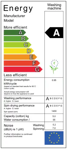 La directive du sur l'étiquetage énergétique[31] prévoit que cet étiquetage comportera trois nouvelles classes (A+, A++ et A+++, mais l'étiquette conservera toujours un total de sept classes). Le périmètre de la directive de 1992 est élargi : les téléviseurs (redevenus très consommateurs avec les grands écrans), chauffe-eau et des chaudières bénéficieront aussi de cet étiquetage, ainsi que des produits ne consommant pas eux-mêmes d'énergie mais ayant « un impact significatif direct ou indirect » sur la consommation ou les économies d'énergie (vitres, châssis de fenêtres, portes externes, etc.). La publicité évoquant des qualités ou un prix liés à l'énergie devra citer la classe d'efficacité énergétique du produit. La Commission espère des économies d'énergie d'environ 27 Mtep/an d'ici 2020, soit 80 millions de tonnes de CO2 par an émis en moins.