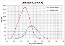 La fonction d'efficacité spectrale photopique mesurée sur un angle de champ visuel de 2° fut normalisée en 1924 et notée .