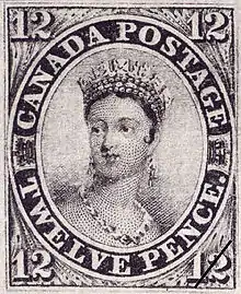 En 1851, c'est la colonie britannique du Canada-Uni (approximativement l'Ontario et le Québec actuels) qui utilise l'effigie Chalon sur ses premiers timbres. Le , l'effigie Chalon apparaît sur deux des six premiers timbres : le 7 pence et demi vert et le 12 pence noir. Le portrait est placé dans un ovale dans lequel sont inscrites les mentions « CANADA POSTAGE » et la valeur faciale en lettres. Il est réutilisé en sur le 12 cents et demi, pour la première émission en dollar canadien ; sa contre-valeur est indiquée en lettres : « SIX PENCE STERLING ». Comme les autres timbres des séries auxquelles ils appartiennent, les Chalon sont commandés à des imprimeurs new-yorkais : Rawdon, Wright, Hatch et Edson, unis dans l'American Bank Note Company lors de la série de 1859[4].