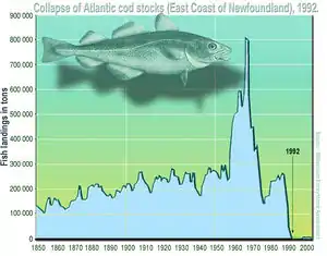 Ces caractéristiques expliquent pourquoi la morue est une espèce vulnérable[26] dont la surexploitation a duré jusqu'à la quasi-disparition de la population. Les pêcheurs ont exploité cette manne pendant 450 ans sans provoquer de surpêche : les limites des techniques traditionnelles, notamment à base de palangres ou de filets maillants de petite taille, permettaient de maintenir un réservoir important de vieux géniteurs capables d'assurer une bonne reproduction. Les techniques de pêche au chalut introduites à la fin des années 1950 ont brisé l'équilibre en permettant de capturer massivement les géniteurs vivant dans des zones plus profondes et au large[27], aboutissant rapidement à une réduction de la biomasse de géniteurs et surtout de leur taille. Pour autant la chute de la biomasse n'a pas dégradé de façon proportionnelle le rendement de la pêche, ce qui a entretenu l'illusion sur l'état du stock. En réalité la population faussement régénérée des années 1980 n'était constituée que de jeunes poissons qui sont de moins bons reproducteurs. La population avait perdu sa capacité à compenser la mortalité liée à la pêche. La gestion mise en place au début des années 1980 visant à reproduire le rendement de la pêche traditionnelle, autour de 250 000 t par an dans la zone principale 2J3KL, fut un échec total. Ces TAC, logiques à l'époque, étaient en réalité largement surévalués car la structure de la population de morue ne permettait plus le rendement qu'elle avait pourtant assuré pendant plusieurs siècles sans montrer de signes d'effondrement.