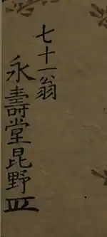 - Titre : Eijudô Hibino (éditeur Nishimuraya Yohachi) à soixante et onze ans (Nanajû-ichi ô Eijudô Hibino)[45].
