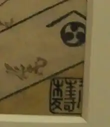 - Marque de l'éditeur : Mitsu tomoe (Nishimuraya Yohachi)[24] bord inférieur juste en dessous de la signature.
