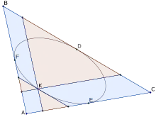 - Soit K un point de l'ellipse de Steiner d'un triangle ABC. Si on trace par K les parallèles aux côtés du triangle, celles-ci découpent ABC en petits triangles et parallélogrammes. La somme des aires des petits triangles (en bleu sur la figure) est égale à la somme des aires des parallélogrammes (en beige)[2].