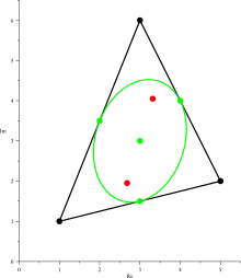 - Si z1, z2 et z3 sont les affixes complexes des sommets du triangle et si P(z) est le polynôme (z – z1)(z – z2)(z – z3), alors les foyers de l'ellipse sont les deux racines du polynôme P', dérivé du polynôme P. C'est le théorème de Marden.