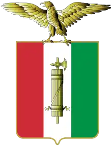 République sociale italienne Un écu tiercé en pal de gueules, d'argent chargé d'un faisceau de licteur au naturel et de sinople, sommé par un aigle romain. |