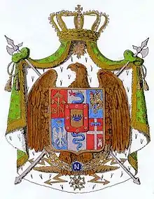 Royaume napoléonien d'Italie Ecartelées de l'Église, de Venise au champ d'azur et le lion portant un bonnet phrygien, de Modène et de Piemont, un pal de Milan-Visconti entre les écartelures, sur le tout d'or à la couronne antique de sable, une bordure de gueules chargée de huit anneaux d'argent. L'écu, ceint du grand collier de l'ordre de la légion d'honneur, est placé sur une aigle napoléonienne, sommée d'une étoile d'or frappée, d'un N et deux haches en sautoir, sous un manteau de sinople sommé d'une couronne royale d'or |