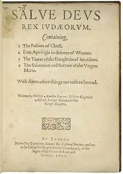 Le titre du poème, Salve Deus Rex Judæorum, est préfacé par dix poèmes plus courts dédiés aux femmes de l'aristocratie, à commencer par la Reine. Il y a aussi une préface en prose adressée au lecteur, comprenant une apologie des « femmes vertueuses » contre l'industrie du sexe. Le titre du poème, un long travail narratif de plus de 200 strophes, raconte l'histoire de la passion du Christ de façon satirique et presque entièrement du point de vue des femmes qui l'entourent. Le titre vient d'une version satirique de la parole soi-disant adressée à Jésus sur la croix. La nature satirique du poème est d'abord identifié par Boyd Berry[15]. Bien que les sujets de la vertu et de la religion soient jugés comme des thèmes convenables pour les femmes écrivaines, le titre du poème de Lanier est considéré par certains chercheurs modernes comme une parodie de la crucifixion. Lanier utilise l'imagerie du grotesque de l'époque élisabéthaine[16], comme le fait Shakespeare dans certaines de ses pièces. Les points de vue exprimés dans le poème sont interprétés comme « indépendants de la tradition de l'Église » et totalement hérétiques[17], bien que d'autres chercheurs comme A. L. Rowse y voient la sincère conversion authentique et le dévouement passionné de Lanier pour le Christ et sa mère. Des comparaisons sont faites entre le poème de Lanier et les satires religieuses que les chercheurs ont étudiées dans les œuvres de Shakespeare, y compris dans le poème The Phoenix and the Turtle[18] et dans de nombreuses pièces de théâtre.
