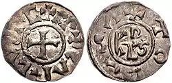 En raison d'un commerce déficitaire avec les Omeyyades (soit directement, soit via Byzance)[40], et de la diminution des échanges avec le monde méditerranéen due à la perte de contrôle de la Méditerranée par Byzance, la diminution du numéraire en or rend nécessaire l'adoption d'une monnaie frappée avec un métal plus abondant en Europe que l'or. D'autre part, il faut une monnaie de valeur plus faible adaptée aux transactions courantes[41]. Le développement du commerce autour de la mer du Nord entraîne la frappe de monnaies d'argent par les Frisons et les Anglo-Saxons dès 680[41]. Au début du règne des Pippinides, les différentes parties de l'Empire utilisent des monnaies différentes, ce qui freine les échanges. En 755, Pépin le Bref prend le contrôle de Dorestadt et des ateliers de frappe de monnaie frisons, le roi affirme son monopole à battre monnaie, ordonnant la frappe d'un denier d'argent normalisé, orné de son monogramme[42].