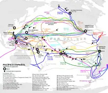 L'empire espagnol dans les Amériques fut formé après avoir conquis des empires indigènes et revendiqué de grandes étendues de terres, à commencer par Christophe Colomb dans les îles des Caraïbes. Au début du XVIe siècle, il conquit et incorpora les empires aztèque et inca, conservant les élites indigènes fidèles à la couronne espagnole et se convertissant au christianisme en tant qu'intermédiaires entre leurs communautés et le gouvernement royal[22],[23]. Après une courte période de délégation de pouvoir par la couronne dans les Amériques, la couronne affirma le contrôle de ces territoires et établit le Conseil des Indes pour superviser le gouvernement là-bas[24]. La couronne établit ensuite des vice-royautés dans les deux principales zones d'implantation, la Nouvelle-Espagne (Mexique) et le Pérou, deux régions de populations indigènes denses et de richesses minérales. La circumnavigation espagnole Magellan-Elcano — la première circumnavigation de la Terre — jeta les bases de l'empire océanique du Pacifique en Espagne et commença la colonisation espagnole des Philippines.