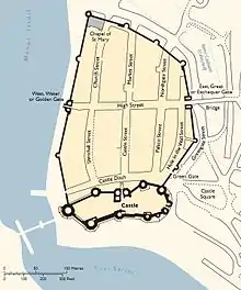 L'enceinte originelle comprenait seulement deux portes, l'une à l'ouest et l'autre à l'est. La première, face au port, est également appelée « Porte d'Or » (Porth-yr-Aur en gallois) à l'époque médiévale, en référence aux murailles de Constantinople[28],[29]. Elle était défendue par une herse jusqu'à des travaux menés au XIXe siècle qui ont vu l'ajout d'éléments gothiques[30]. La deuxième porte, à l'est, permettait d'entrer en ville depuis les terres. Elle surplombait la Cadnant, une rivière aujourd'hui recouverte[31]. Le corps de garde abrite des bureaux officiels jusqu'aux années 1960 : d'abord l'échiquier, puis l'hôtel de ville et enfin le hall de guilde[32],[23]. Il ne subsiste pas grand-chose du corps de garde originel depuis les travaux des XVIIIe et XIXe siècles, sinon la base des tours[24],[32]. Aux deux portes d'origine se sont ajoutées de nouvelles portes percées ultérieurement, dont Northgate, Greengate et l'entrée de Market Street[21].