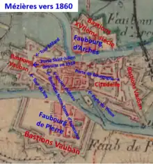 Le Maréchal de Saint-Paul, Chef ligueur décide de faire de Mézières un bastion catholique et de raser le tiers est de la ville pour construire une citadelle d’avril 1591 à octobre 1593. Cette fortification était destinée à protéger la ville d’une attaque d’Henri de la Tour Vicomte de Turenne prince de Sedan du parti huguenot. À l’est de la citadelle, la porte de Bourgogne dont l’entrée est défendue par un pont-levis remplace la porte de l’image du XIIIe siècle.