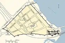 Les historiens ont longtemps considéré que la conception des défenses de Caernarfon était inspirée des bastides, ces villes nouvelles créées à l'époque en France (y compris en Guyenne, possession des rois d'Angleterre) qui se caractérisent par leur plan de rues en damier et leurs défenses qui comprennent à la fois une enceinte et un château[7]. Des travaux plus récents ont mis en évidence une influence davantage anglaise dans la création des villes nouvelles édouardiennes[8], en particulier par l'utilisation d'un plan de rues en T perpendiculaire à un cours d'eau ou au littoral, avec le château généralement situé à l'un des coins opposés du T[9]. Ainsi, le plan de rues de Conwy est le reflet inversé de celui de Beaumaris, une autre fondation galloise d'Édouard Ier[10].