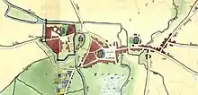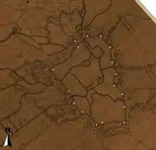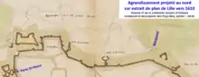 - Blieck et Vanderstraeten listent d'après les comptes de travaux de à les parties suivantes de l'enceinte attestées comme étant construites en terre (dans le sens horaire) : à la porte de Saint-Pierre, derrière la collégiale Saint-Pierre, à la porte de Courtrai, près de la tour du Couvent des Frères Mineurs jusqu'à la porte des Reignaux, au niveau de la porte Saint-Sauveur, près de la porte du Molinel et à la porte de la Barre[9]. Toutes ces sections à l'exception de la porte de la Barre et celle de Courtrai sont attestées comme construites en terre sur un plan des fortifications de Lille fait en 1599 pour servir à des propositions d'agrandissement[10]. Dans le cas des porte de la Barre comme celle de Courtrai, la réalisation d'une courtine maçonnée semble ultérieur, dans le cas de la porte de Courtrai, il se peut cependant que les comptes de travaux se référent à l'ancienne porte de Courtrai qui est remplacée par une autre à la construction du château de Courtrai.
