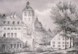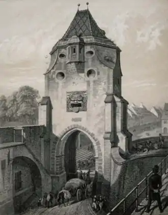 La porte est séparée d'une ancienne tour défensive pentagonale par un immeuble d'habitations aménagé à l'endroit de la muraille. Cette tour appartient également à l'enceinte du XIIIe siècle. Après 1870, plusieurs artistes y ont abrité leurs ateliers dont Lothar von Seebach (1853-1930)[30],[31].