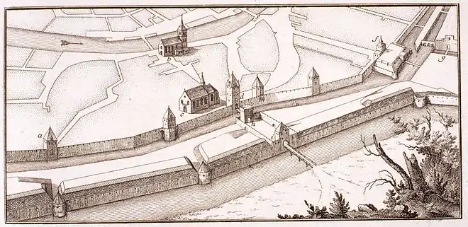 Vue sur les fortifications strasbourgeoises à la sortie de l'İll.
