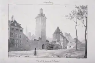Après l'extension de la ville vers le nord, la Porte des Bœufs, aussi connue sous le nom de Rindshüterthor (Porte des Tanneurs), est remplacée en 1322 par une tour porte dénommée Pfennigturm (Tour aux Deniers) faisant office de tour communale à l'image des beffrois du nord de la France. La tour comptait trois étages voûtés. Elle était flanquée aux quatre angles de quatre tourelles dans lesquelles montaient des escaliers en hélice. En 1414, la foudre ravagea la toiture et il fut décidé d'ajouter un étage supplémentaire doté d'une plate-forme terrasse. La Tour aux Deniers, en tant que symbole des libertés municipales, abritait le trésor et les services financiers de la ville supervisés par quatre préposés. La tour renfermait aussi les archives les plus précieuses comme les chartes, les privilèges ou encore les bannières. La terrasse fut dotée d'une table ovale en pierre, à quatre pieds massifs sculptés aux armes de la ville. Chaque année, le 24 juin, jour de la Saint-Baptiste, un banquet réunissait l'ensemble des autorités municipales (le Magistrat) afin de célébrer le commencement de l'année politique[23]. Après le rattachement de Strasbourg à la France, en 1745, la tour fut démolie jusqu'à la voûte du premier étage puis définitivement rasée en 1768. Sa disparition facilita la circulation des véhicules et débarrassa la place Kléber d'un édifice jugé trop gothique dans le cadre d'un plan d'aménagement urbain imaginé par Jacques-François Blondel (1705-1774), architecte et urbaniste parisien mandaté par le roi Louis XV[24].