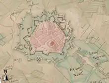 - en 1712, deux demi-lunes non revêtues sont construites en avant de la courtine 7-8 entre la demi-lune 17 et la demi-lune du gard (18)[note 14] ;