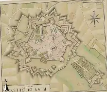 - en 1710, on propose de remplacer les ouvrages détachés du projet de 1701 par quatre lunettes et en 1711 ou 1712 on construit cinq lunettes en avant de la courtine 4-5[note 13], elles vont être abandonnés plus tard au cours du siècle ;