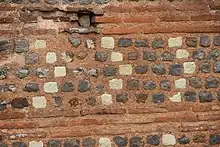 La muraille est du type commun dans toute la construction romaine, constituée d'un blocage en béton de rocaille et mortier d'opus caementicium entre deux murs de parement[AA 6] ornés ici de motifs raffinés, entre des chaînages horizontaux de briques plates. L'enceinte présente une succession de bandes de briques et de moellons de couleurs diverses provenant de récupération de matériaux anciens mais aussi d'extractions nouvelles[G 10].