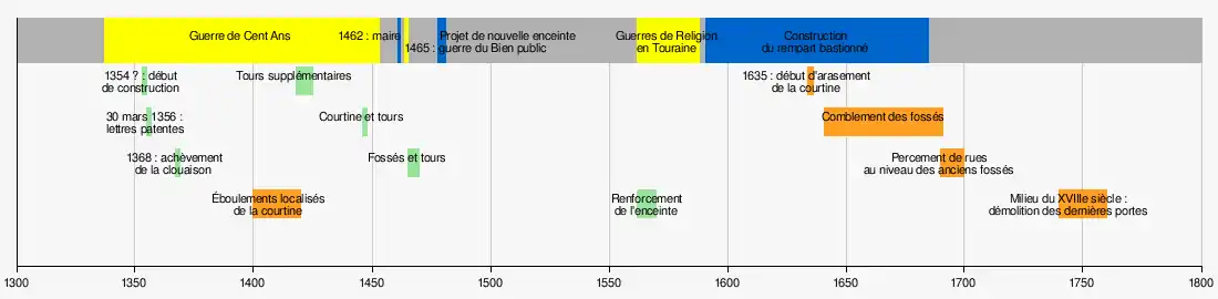 ■ Épisode de l'histoire de France et ■ de Tours directement lié à l'évolution de la clouaison - ■ Phase de construction - ■ Phase de destruction ou de fragilisation