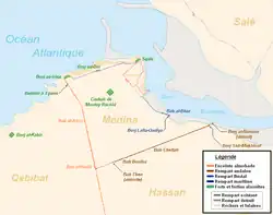La muraille ouest s'embranchait à la précédente au niveau du croisement de l’allée sud du bois de Moulay Abdellah et de l'avenue Omar ibn al-Khattab. En direction du nord, son emprise suit l'avenue Omar ibn al-Khattab, la place Abdellah ibn Yassine, la rue Abou Hassan al-Ach'ari, la place de Tamesna puis l'avenue Kebibat jusqu’à la mer.