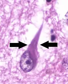 Microscopie d'une cellule présentant des enchevêtrements neurofibrillaires (marqués par des flèches).