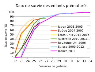 La limite de viabilité actuelle est de 22 SA ou tout enfant pesant au moins 500 grammes[4].