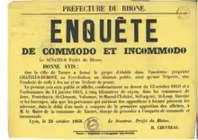 Une disposition à valeur constitutionnelle, l'article 17 de la Déclaration des Droits de l'homme et du citoyen de 1789, proclame que « La propriété étant un droit inviolable et sacré, nul ne peut en être privé, si ce n'est lorsque la nécessité publique, légalement constatée, l'exige évidemment, et sous la condition d'une juste et préalable indemnité ». Afin de légaliser le constat de nécessité publique, la base du dispositif français d'enquête publique est une loi impériale de 1810[13] votée pour garantir le respect du droit de propriété lors des expropriations. Une loi de 1833[14] a introduit l’enquête préalable (dite de « commodo et incommodo ») à la Déclaration d'utilité publique (ou DUP). Une ordonnance de 1958[15] oblige l'enquête et l'avis favorable avant prise de DUP. Un décret de 1959[16], revu en 1977[17], explicite les caractéristiques de l'enquête préalable à la DUP, avec l’objectif de défendre le droit des propriétaires avant de valider les projets de l’administration. Une ordonnance en 2014[18] a modifié cette réglementation dans les articles L110-1[19] et L112-1 et R112-1[20] à -24 du Code de l'expropriation pour cause d'utilité publique. Cette enquête dénommée d'utilité publique a donc constitué le fondement historique de l'enquête publique en France. Elle n'est maintenant qu'un cas particulier et minoritaire des enquêtes publiques. Elle est ouverte et organisée par le préfet du département[21] et ses conclusions ne sont communiquées aux personnes intéressées que sur leur demande[22].