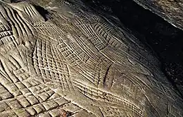 Hormis les ajouts sous abris mentionnés ci-dessus, les gravures pouvant être rattachées à la période du Néolithique se trouvent en plein air, sur des surfaces naturelles de rochers ou sur des mégalithes. Un motif particulier se détache, celui des anthropomorphes « emplumés »[10]. Ces représentations humaines très stylisées et dotés d'un couvre-chef vraisemblablement orné de plumes sont fréquemment accompagnées d'autres motifs et notamment de représentations de haches qui permettent de dater ces pétroglyphes du début de la période néolithique locale, soit environ [11].