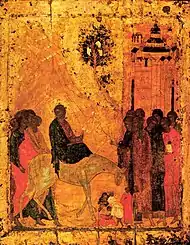 Jésus monte alors l'ânon à Jérusalem, les trois évangiles synoptiques indiquant que les disciples avaient au préalable déposé leurs manteaux sur ce dernier, de manière à le rendre plus confortable. Dans la tradition juive, l'âne semble avoir été un animal positif, symbolisant l'humilité et la paix, alors que le cheval symbolise le luxe et la violence guerrière[8],[9],[10].