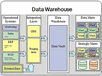Le concept de data warehousing remonte à la fin des années 1980 [4] lorsque les chercheurs d'IBM Barry Devlin et Paul Murphy ont développé le « business data warehouse ». Essentiellement, le concept d'entreposage de données visait à fournir un modèle architectural pour le flux de données des systèmes opérationnels aux environnements d'aide à la décision.