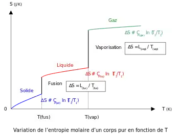 L'entropie d'un corps pur dans ses différents états (solide, liquide, gaz) se calcule à partir des coefficients calorimétriques, notamment les capacités thermiques. L'entropie de changement d'état permet de la calculer lorsque le corps est biphasique lors d'un changement d'état.