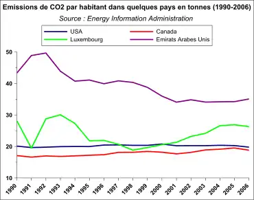En 2006, avec plus de 5 700 millions de tonnes par an, les États-Unis sont le deuxième pays émetteur de dioxyde de carbone du monde derrière la Chine[22]. Rapporté au nombre d'habitants, les émissions américaines sont de 19,1 tonnes/hab., soit le huitième taux le plus fort du monde[22].