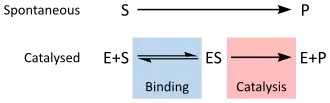 La vitesse de réaction dépend de l'énergie d'activation nécessaire pour atteindre, à partir des substrats, l'état de transition, qui évolue ensuite vers la formation des produits de réaction. Les enzymes accélèrent la vitesse de réaction en abaissant l'énergie d'activation de l'état de transition. Elles commencent par établir une liaison enzyme-substrat (ES) de faible énergie, stabilisent par la suite l'état de transition (ES‡) de sorte qu'il requiert moins d'énergie pour se former, et font évoluer cet état de transition vers un complexe enzyme-produit (EP) qui se dissocie spontanément.