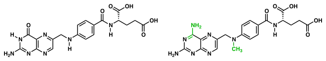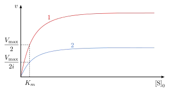 Un inhibiteur compétitif peut se lier à l'enzyme en empêchant ses substrats de le faire[36]. Il s'agit souvent d'une molécule qui ressemble à l'un des substrats et prend sa place sur l'un des sites de liaison mais sans que l'enzyme puisse catalyser la réaction chimique avec cet inhibiteur. Ainsi, le méthotrexate, un anticancéreux, est un inhibiteur compétitif de la dihydrofolate réductase, qui catalyse la réduction du dihydrofolate en tétrahydrofolate. Ce type d'inhibition peut être contourné par une concentration élevée en substrat. Il peut également s'agir d'une molécule qui se lie sur un autre site de l'enzyme et induit des changements conformationnels qui modifient les propriétés du site de liaison au substrat par effet allostérique. En conséquence, l'affinité de l'enzyme pour ses substrats diminue et sa constante de Michaelis KM augmente, tandis que sa vitesse maximum Vmax demeure inchangée.