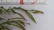 C'est une plante annuelle de 2 à 20 dm, glabre et pelant proximalement, strigeux et généralement à poils glanduleux distalement. Les feuilles sont généralement précoces-caduques, de 10–55 mm, linéaires à étroitement elliptiques, acuminées, généralement repliées le long de la nervure médiane, plus ou moins glabres ; le pétiole mesure de 0 à 4 mm[3].