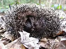 Le Hérisson européen hiberne. Sous l'effet de changements hormonaux[9], en début de l'automne, il prépare un nid garni de feuilles mortes puis se roule en boule et s'endort d'un profond sommeil entrecoupé de brefs réveils. Cet hibernant utilise 30 % des réserves de graisses accumulées dans son corps au cours de la belle saison.