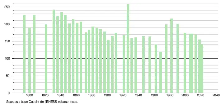 L'évolution du nombre d'habitants est connue à travers les recensements de la population effectués dans la commune depuis 1793. Pour les communes de moins de 10 000 habitants, une enquête de recensement portant sur toute la population est réalisée tous les cinq ans, les populations légales des années intermédiaires étant quant à elles estimées par interpolation ou extrapolation[17]. Pour la commune, le premier recensement exhaustif entrant dans le cadre du nouveau dispositif a été réalisé en 2008[18].