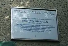 Dans les années 1960, ses héritiers reçoivent une indemnité de 56 000 DM de la Cour d'appel de Berlin[3]. Une tombe familiale au cimetière de Zehlendorf porte également son nom[4]. Ce mémorial pour Ernst von Harnack (champ 11-HW-22/23) est dédiée comme tombe d'honneur de Berlin depuis 1952. La consécration est prolongée en 2018 de la durée habituelle de vingt ans[5].