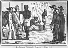 C'est aussi le système de l'indenture qui est appliqué lors de l'arrivée d'une vingtaine d'Africains en 1619 près de Jamestown en Virginie[21],[22], qui se produit par le hasard d'avaries sur un navire corsaire hollandais, obligé d'accoster sur la terre la plus proche, car souffrant de sérieuses avaries. La vingtaine de Noirs à bord n'étaient pas destinés à la Virginie, car les hollandais les avaient trouvés sur un navire négrier espagnol. Le corsaire passe un mois dans la colonie, et y débarque les esclaves, recevant de la nourriture et de l'aide pour des réparations.