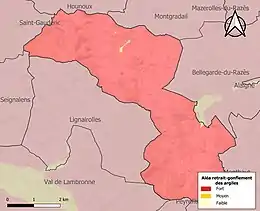 Le retrait-gonflement des sols argileux est susceptible d'engendrer des dommages importants aux bâtiments en cas d’alternance de périodes de sécheresse et de pluie. La totalité de la commune est en aléa moyen ou fort (75,2 % au niveau départemental et 48,5 % au niveau national). Sur les 135 bâtiments dénombrés sur la commune en 2019, 135 sont en aléa moyen ou fort, soit 100 %, à comparer aux 94 % au niveau départemental et 54 % au niveau national. Une cartographie de l'exposition du territoire national au retrait gonflement des sols argileux est disponible sur le site du BRGM[22],[Carte 3].