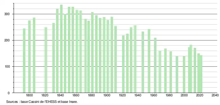 L'évolution du nombre d'habitants est connue à travers les recensements de la population effectués dans la commune depuis 1793. Pour les communes de moins de 10 000 habitants, une enquête de recensement portant sur toute la population est réalisée tous les cinq ans, les populations légales des années intermédiaires étant quant à elles estimées par interpolation ou extrapolation[26]. Pour la commune, le premier recensement exhaustif entrant dans le cadre du nouveau dispositif a été réalisé en 2008[27].