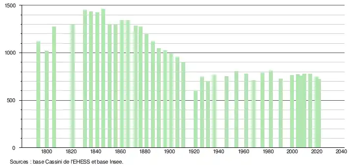 L'évolution du nombre d'habitants est connue à travers les recensements de la population effectués dans la commune depuis 1793. Pour les communes de moins de 10 000 habitants, une enquête de recensement portant sur toute la population est réalisée tous les cinq ans, les populations légales des années intermédiaires étant quant à elles estimées par interpolation ou extrapolation[32]. Pour la commune, le premier recensement exhaustif entrant dans le cadre du nouveau dispositif a été réalisé en 2004[33].