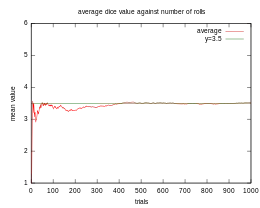 L'espérance est fortement liée à l'idée de moyenne[12]. En effet, la notion de hasard empêche de prédire le résultat d'une seule expérience aléatoire mais la loi des grands nombres permet de mieux maitriser le résultat si on exécute un grand nombre d'expériences aléatoires de même type. Ainsi, au cours d'un seul lancer de dé, chaque face a normalement une chance sur 6 d'apparaître et il est difficile de prédire le résultat moyen sur trois lancers de dé. Mais, en renouvelant mille fois ou dix mille fois le lancer, les résultats se répartissent presque équitablement entre les différents nombres de 1 à 6[13]. La moyenne des nombres obtenus au cours de ces nombreux lancers s'approche alors de qui correspond à l'espérance de cette expérience de lancer de dé. L'espérance sert donc à prévoir la valeur moyenne obtenue pour la variable que l'on mesure si l'expérience est renouvelée un très grand nombre de fois. Elle sert par exemple, en théorie des jeux, à prévoir la somme moyenne que chaque joueur va remporter[14]. Elle sert aussi dans le domaine des assurances pour déterminer le coût moyen d'une assurance permettant de couvrir les frais consécutifs aux accidents.