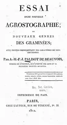 Essai d'une nouvelle agrostographie, (abrégé en Ess. Agrostogr.)[1], est un ouvrage illustré avec des descriptions botaniques publié par le naturaliste et botaniste français, Ambroise Marie François Joseph Palisot de Beauvois. Il fut publié à Paris en 1812, sous le titre de Essai d'une Nouvelle Agrostographie ; ou Nouveaux Genres des Graminées; Avec Figures Représentant les Caractéres de tous le Genres. Imprimerie de Fain.