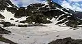 | Position de l'estany Esbalçat sur la carte géologique de l'Andorre | Pic des Fangasses surmplombant le lac |