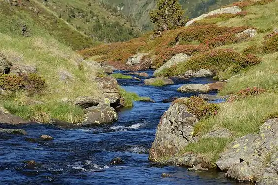 | Position des Estanys de Tristaina sur la carte des bassins hydrographiques de l'Andorre | Riu de Tristaina bordé de rhodoraies |