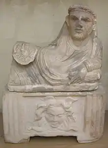 - Seule la tête, ressemblante, a des proportions humaines, le reste est raccourci à la taille de l'urne cinéraire (Volterra) « Les parties non visibles négligées, déformées par la place qu'elles occupent »[3].