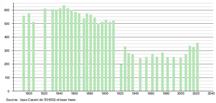 L'évolution du nombre d'habitants est connue à travers les recensements de la population effectués dans la commune depuis 1793. Pour les communes de moins de 10 000 habitants, une enquête de recensement portant sur toute la population est réalisée tous les cinq ans, les populations légales des années intermédiaires étant quant à elles estimées par interpolation ou extrapolation[40]. Pour la commune, le premier recensement exhaustif entrant dans le cadre du nouveau dispositif a été réalisé en 2006[41].